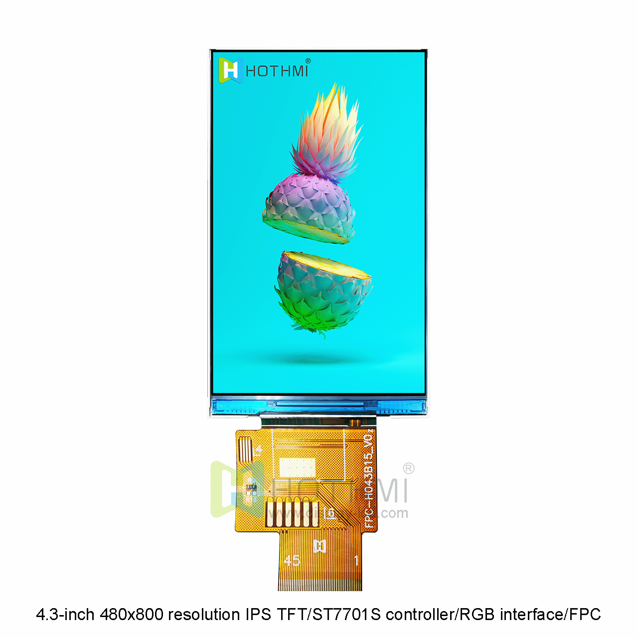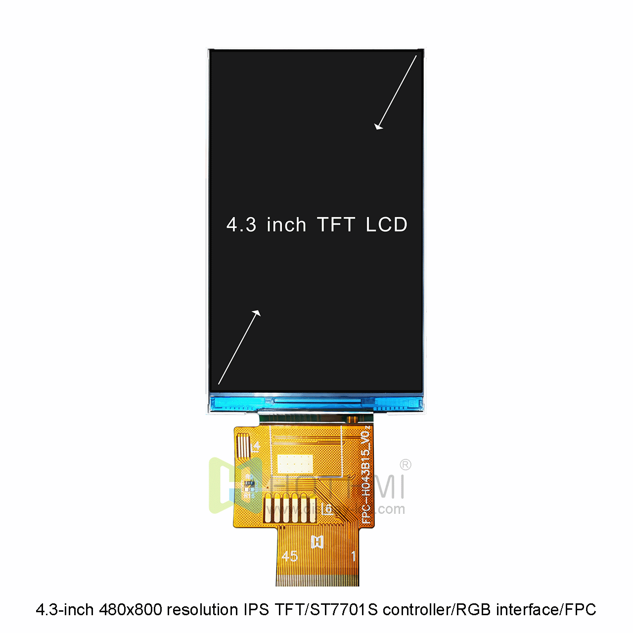 • Model : 4.3-inch 480x800 resolution IPS TFT/ST7701S controller/RGB interface/FPC plug-in/STM32/RK TFT-H043B15WVIST4N45