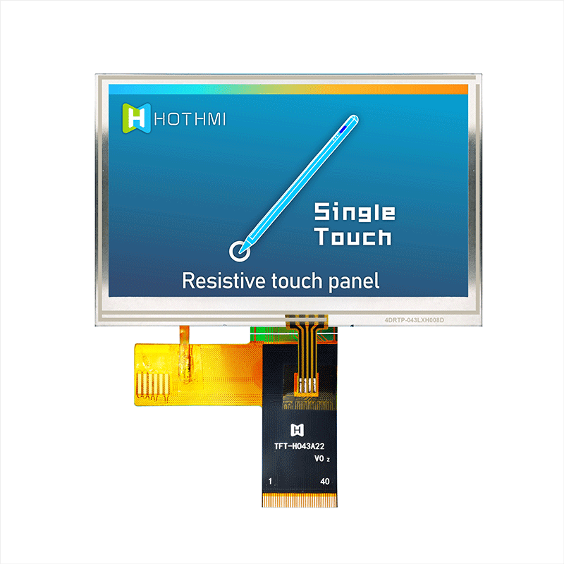 Location:Home  >  Product center  >  TFT display  >  TFT display standard products | Full-view TFT color screen | High-brightness series TFT  >  4.3 寸SPI TFT彩屏 | 480x272點陣| 陽光下可讀|4線電阻式觸摸屏 | MCU TFT 顯示屏 /TFT-H043A22WQIST8R40