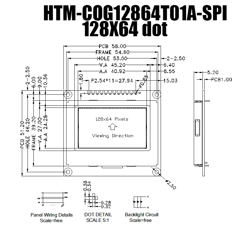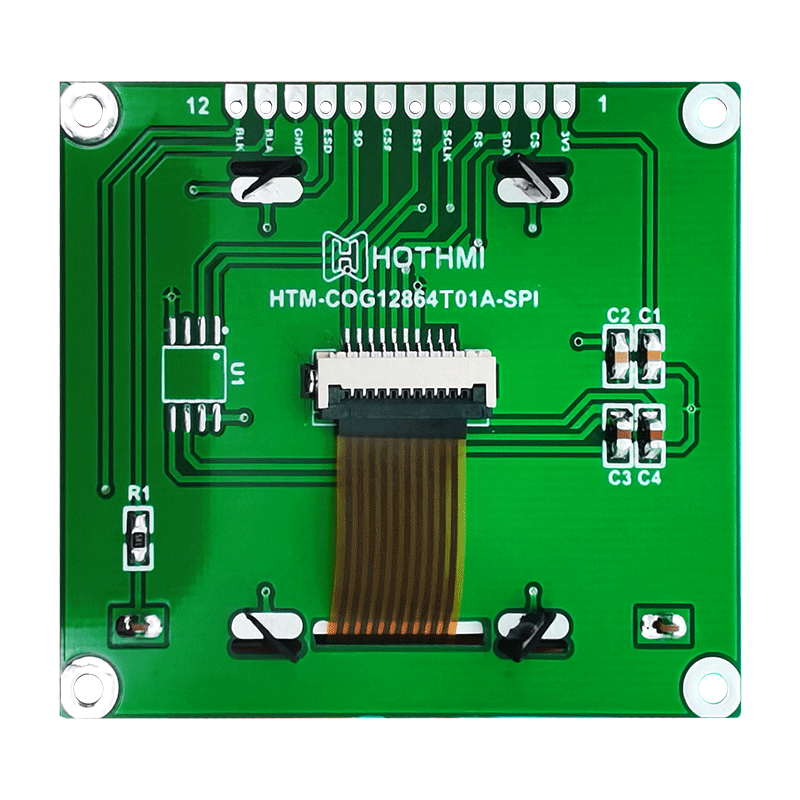 HTM-COG12864T01A-SPI | Monochrome Graphic Module | 128x64 Pixels | Transflective LCD | Side White Backlight | FSTN (+) Positive Display | Built-in Negative Voltage | IN-STOCK