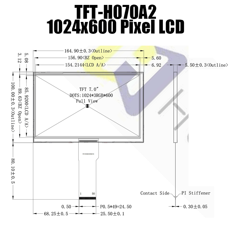TFT-H070A2WSIFT8N50 | 7.0" IPS LCD Display | TFT LCD Display Manufacturer | 1024x600 resolution | -20℃~70℃ | Sunlight Readable Monitors IC EK79001+EK73215 | Interface TTL 24 bit