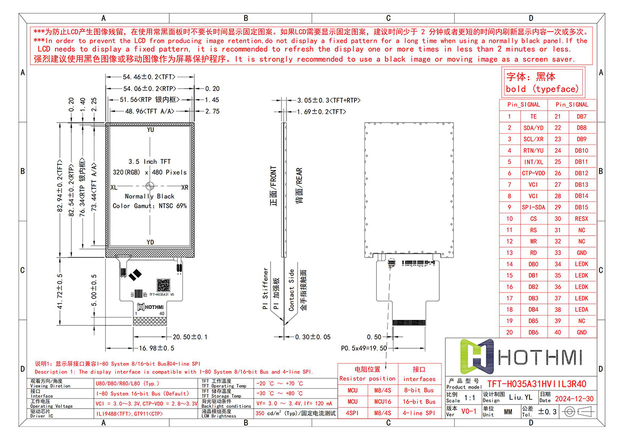 TFT-H035A31HVIIL3R40是一款高性能3.5英寸TFT液晶顯示屏,專為嚴(yán)苛環(huán)境與多樣化應(yīng)用場景設(shè)計。該產(chǎn)品采用常黑面板(Normally Black)技術(shù),搭配320(RGB)×480像素分辨率,可呈現(xiàn)清晰細(xì)膩的圖像效果,并支持NTSC 69%廣色域,色彩表現(xiàn)生動逼真,適用于工業(yè)控制、智能家居及便攜設(shè)備等領(lǐng)域。其工作溫度范圍覆蓋-30℃至+80℃,儲存溫度達(dá)-20℃至+70℃,結(jié)合350 cd/m2的高亮度和VCI寬電壓設(shè)計(3.0~3.3V),確保在復(fù)雜環(huán)境下穩(wěn)定運(yùn)行。接口兼容I-80 System 8/16-bit總線及4線SPI,適配靈活,便于與多種主控芯片快速集成。產(chǎn)品特別優(yōu)化了防圖像殘留功能,內(nèi)置動態(tài)刷新機(jī)制,建議搭配黑色或動態(tài)屏保以延長屏幕壽命。無論是精密儀器儀表還是消費(fèi)電子產(chǎn)品,TFT-H035A31HVIIL3R40均以卓越的可靠性和適應(yīng)性,為您的顯示解決方案提供強(qiáng)勁支持。