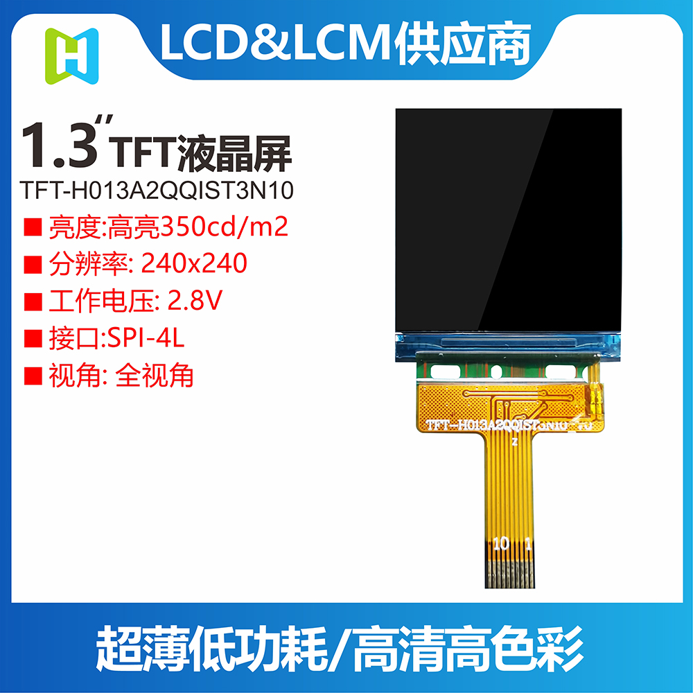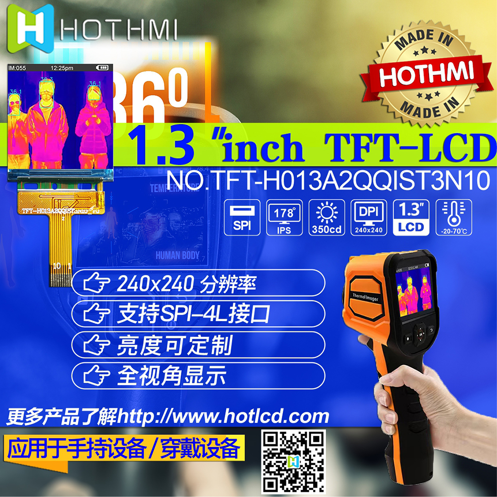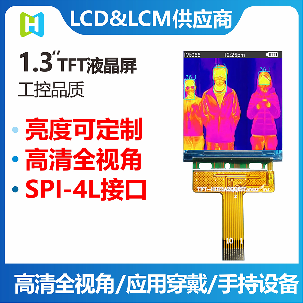 這款1.3寸TFT彩屏,非常適用于手持式紅外測溫槍顯示屏(紅外測溫儀顯示屏),支持SPI接口,具有尺寸方正、結構緊湊、高亮度、全視角、色彩豐富的特點,顯示數(shù)據(jù)一目了然。