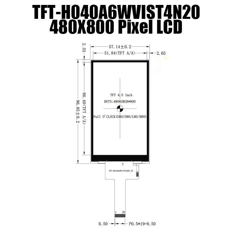TFT-H040A6WVIST4N20 | 4.0" IPS LCD | 480x800px 屏幕 | 無觸摸屏 | TFT-H040A6WVIST4N20