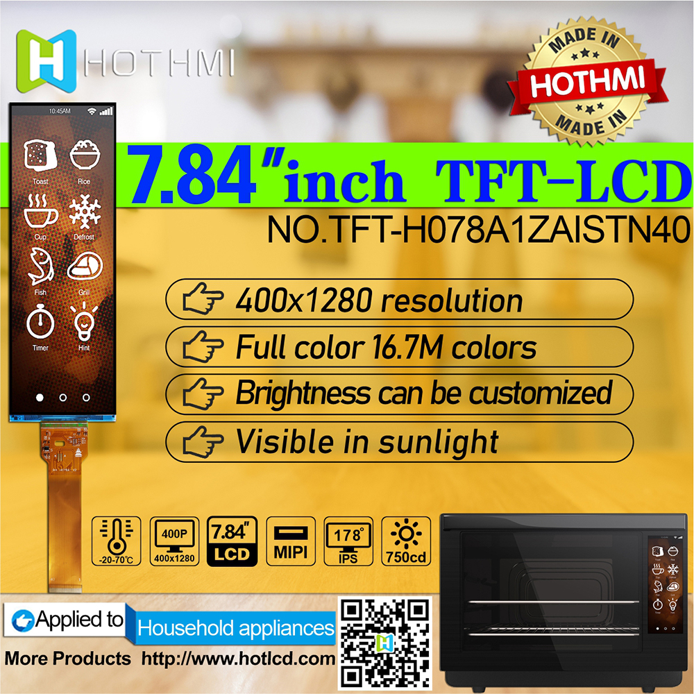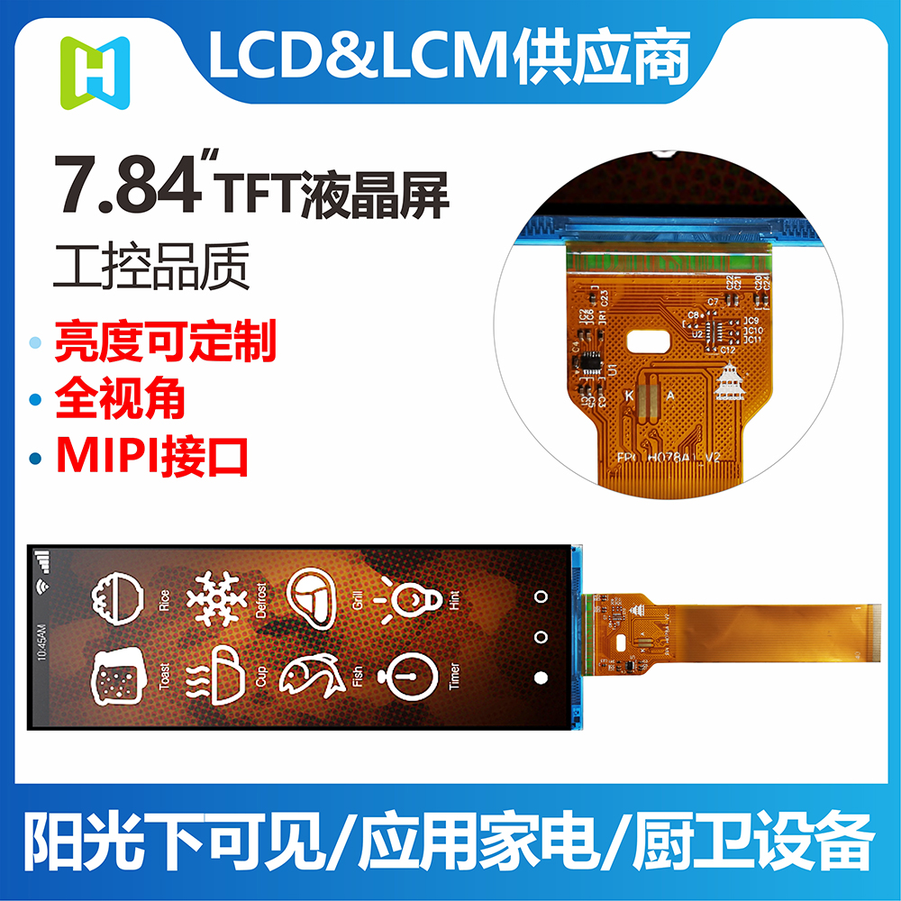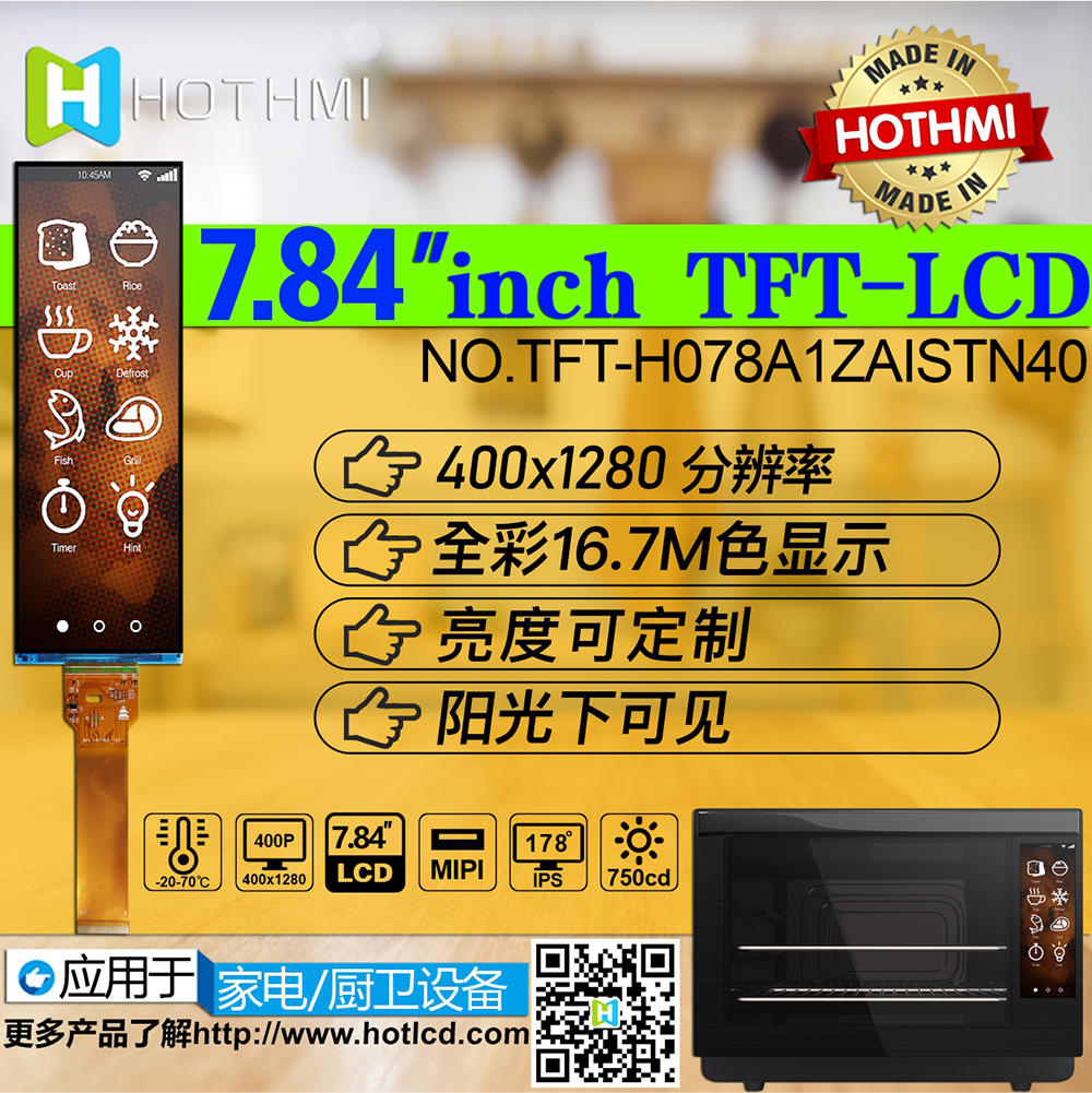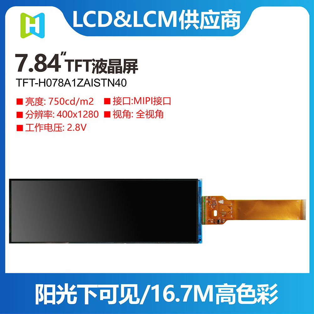 TFT- H078A1ZAISTN40是一款7.84寸采用IPS面板技術(shù)的TFT液晶顯示器模塊。此款TFT-LCD分辨率400 x 1280 pixels。TFT- H078A1ZAISTN40模塊內(nèi)置ST7703 driver IC,支持MIPI接口,對(duì)比度700 (典型值),模塊亮度為700 nits(典型值)。H078A1采用IPS面板技術(shù),視角比TN玻璃更廣范圍為左: 80 / 右: 80 / 上: 80 / 下: 80 度,色彩鮮明,具有飽和自然的優(yōu)質(zhì)畫面。H078A1模塊的驅(qū)動(dòng)電壓為3.3V,平常黑/透射式LCD,霧面玻璃,屏幕長(zhǎng)寬比3:1。。此款模塊的工作溫度是-20℃ 至 +70℃,儲(chǔ)存溫度是 -30℃ 至 +80℃。如果客戶產(chǎn)品應(yīng)用需要使用高亮TFT,可選用TFT- H078A1ZAISTN40模塊,其模塊亮度為700 nits (典型值)。