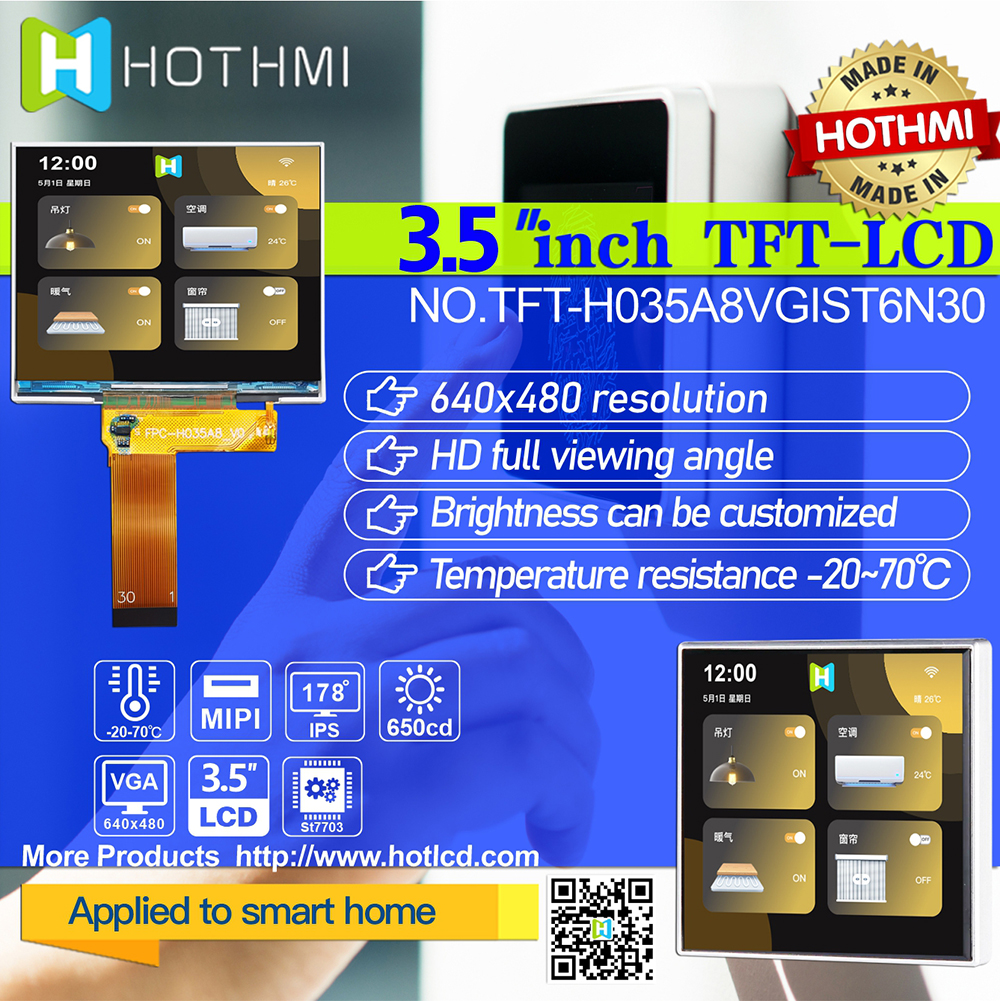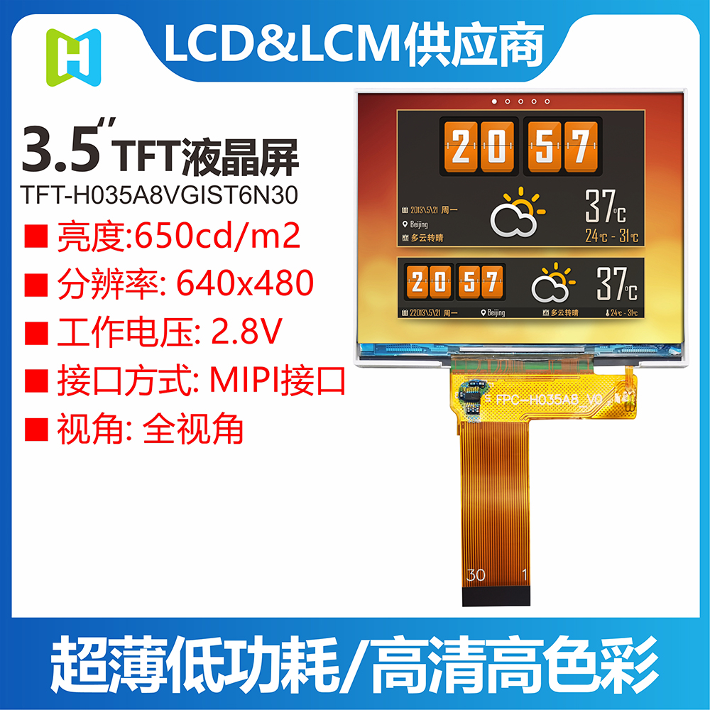 產(chǎn)品說明 TFT-H035A8VGIST6N30 是一款 3.5 英寸全彩 TFT LCD 模塊,分辨率為 640x480 像素,縱橫比為 1.25:1。 TFT模塊采用ST7703驅(qū)動(dòng)IC,支持MIPI接口。 采用IPS面板的TFT模組具有廣視角優(yōu)勢(shì)(左80度/右80度/上80度/下80度),典型對(duì)比度800:1,模組亮度高達(dá)650尼特 (典型值)。 模塊工作溫度范圍-20℃~+70℃,儲(chǔ)存溫度范圍-30℃~+80℃。