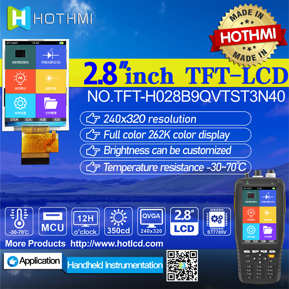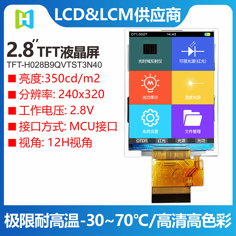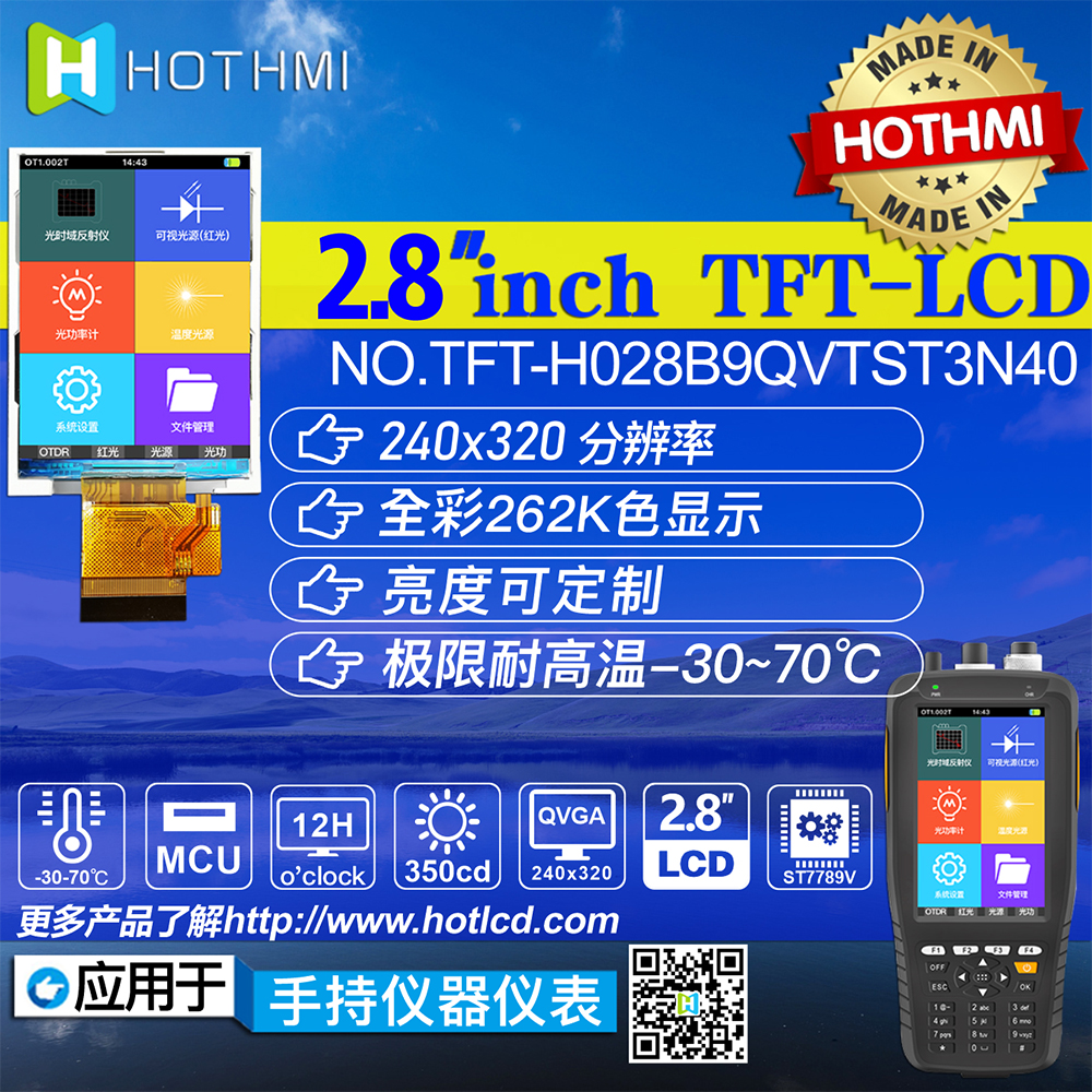 TFT-H028B9QVTST3N40是HOTLCD研發(fā)團(tuán)隊(duì)精心設(shè)計(jì)的2.8英寸TFT彩色液晶屏,240*320分辨率,高畫(huà)質(zhì),廣視角,65K/262K真彩色,內(nèi)置ST7789V控制器,支持MCU接口,40PIN外掛FPC可以接主板(可選接頭),單電源DC 2.8V供電。 TFT 模塊可配備觸摸屏,所有材料均符合 RoHS 標(biāo)準(zhǔn)。 廣泛應(yīng)用于各種儀表、智能設(shè)備、分析儀器、手持儀表、行車記錄儀等:8051、PIC、AVR、ARDUINO、ARM、樹(shù)莓派等。