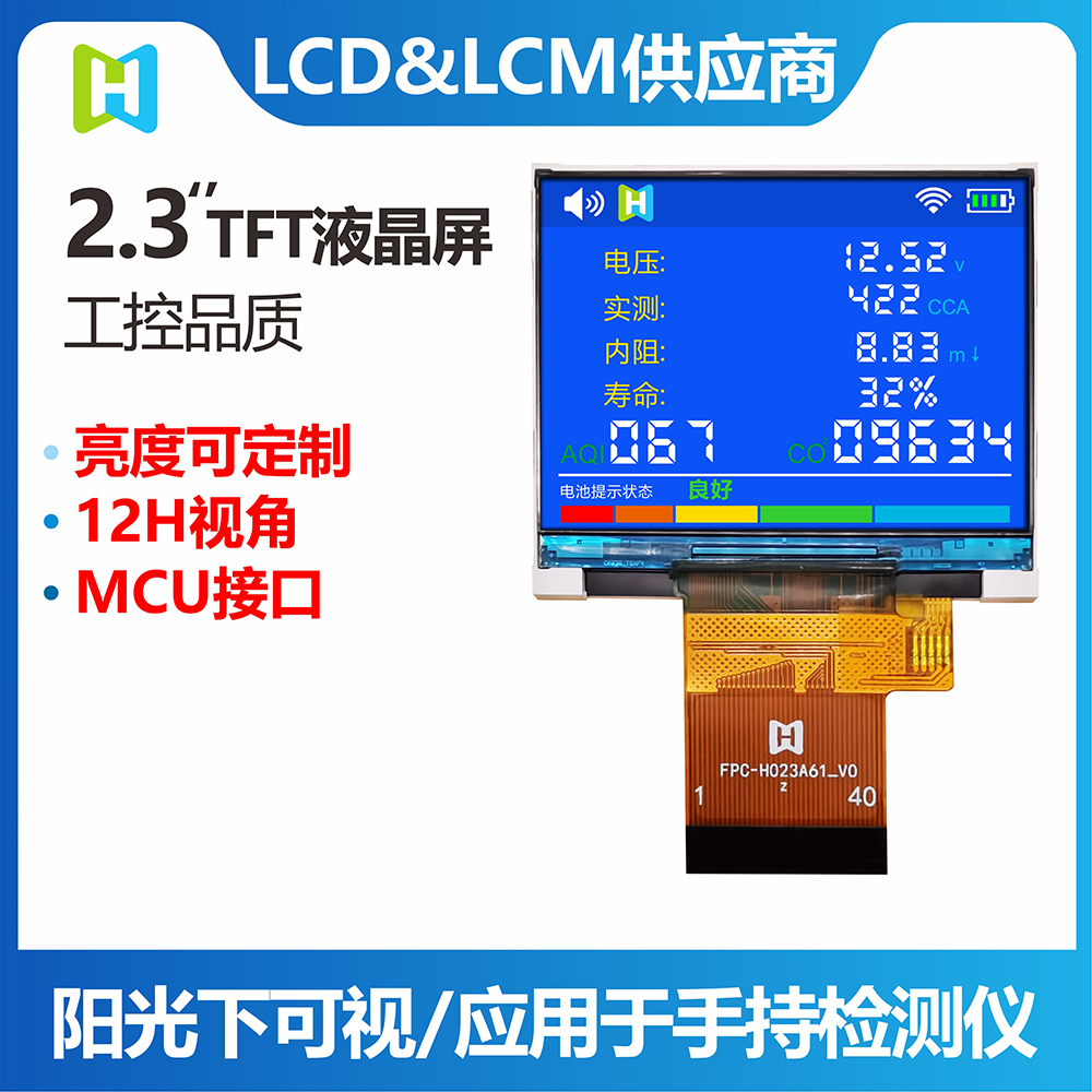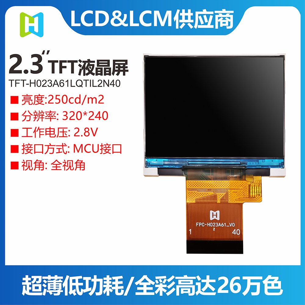 TFT-H023A61LQTIL2N40是一款工業(yè)級橫屏顯示的 TFT LCD液晶屏,分辨率為320*240像素,液晶屏typical 亮度為400 nits,視角為12H方向;供電電壓(VCI)為2.8V~3.2V,typical 值為2.8V。工作溫度為-20℃~+70℃,儲存溫度為-30℃~+80℃。產(chǎn)品使用于各項小型智能設(shè)備,家電,監(jiān)控器等。