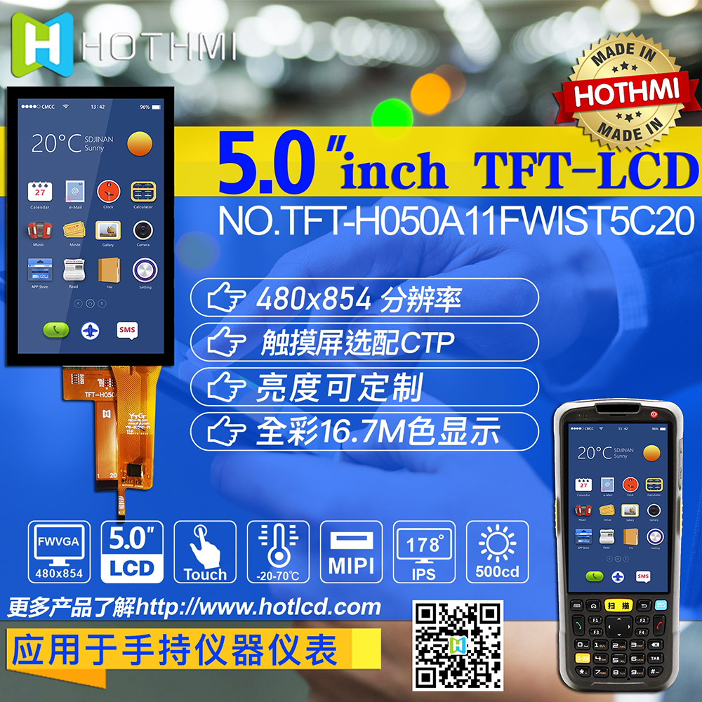 TFT-H050A11FWIST4C20 是一款 5.0 英寸寬溫 IPS TFT-LCD 顯示器,帶有投射電容式觸摸屏,分辨率為 480x854 像素。 模塊內(nèi)置ST7701驅(qū)動IC,支持MIPI接口。 TFT-H050A11FWIST4C20采用IPS面板,具有視角更廣的優(yōu)勢,左:80/右:80/上:80/下:80度(典型),對比度800:1(典型),亮度500尼特(典型) ) 值),眩光面板,16:9 縱橫比。 觸摸屏內(nèi)置GT911 IC,支持I2C接口和多點觸控功能。 H050A11 型號具有投射電容式觸控面板 (PCAP),但沒有觸控面板選項 (TFT-H050A11FWIST5N20)。 TFT-H050A11FWIST4C20的供電電壓(VCC)為3.0V至3.6V,典型值為3.3V。 它可以在 -20°C 到 +70°C 的溫度和 -30°C 到 +80°C 的存儲溫度下工作。