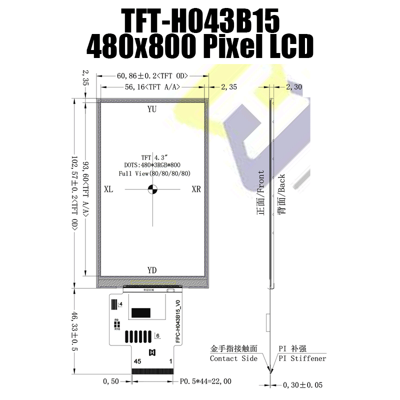 TFT-H043B15WVIST4N45 | 4.3英寸IPS LCD顯示屏 | TFT LCD顯示屏制造商 | 480x800分辨率 | -20℃~70℃ | 用于儀器儀表