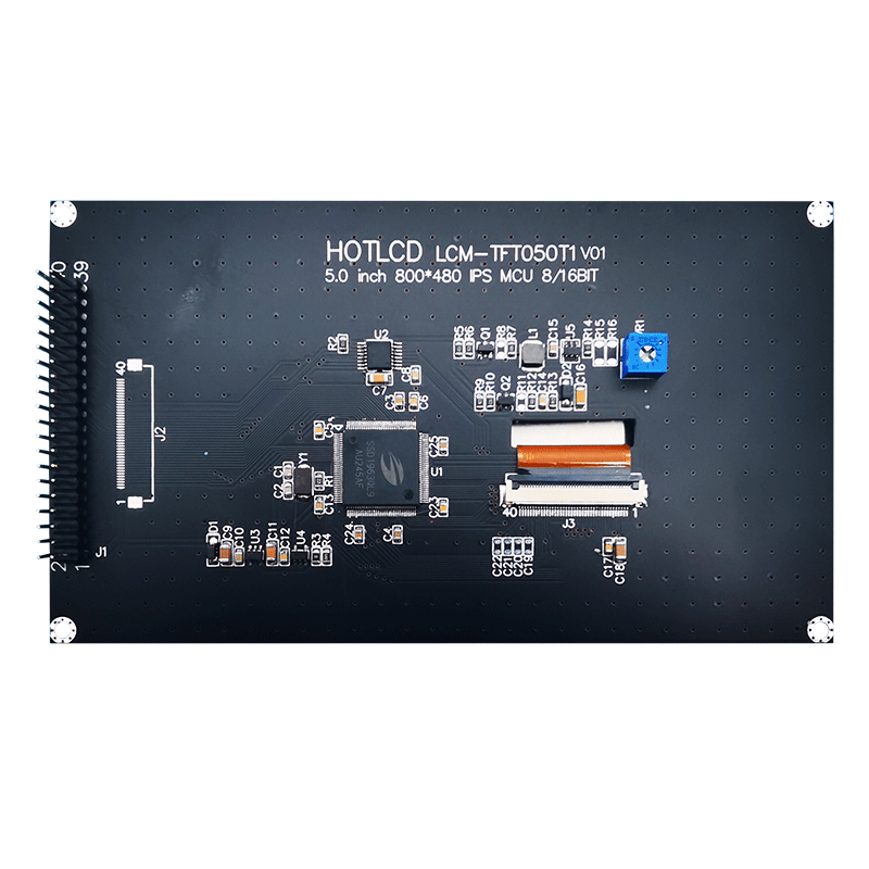 因此,鑫洪泰HOTLCD研發(fā)團隊設(shè)計一款方便客戶使用的MCU8/16位接口的5.0寸高清TFT顯示模塊 LCM-TFT050T1,具有高清800x480分辨率,高畫質(zhì),全視角,65K/262K真彩色,內(nèi)置SSD1963控制器,無需外圍電路即可連接主板(可選配連接器),單電源DC3.3V供電。此款TFT模塊可選配觸摸屏并內(nèi)置XPT2046電阻觸摸屏驅(qū)動器。