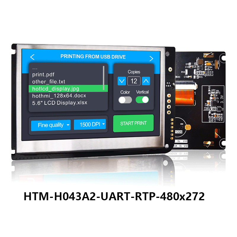 隆重推出 HTM-H043A2-A5-UART-RTP,這是 TFT LCD 顯示器領(lǐng)域的工程和設(shè)計奇跡。 這款 4.3 英寸 IPS LCD 顯示屏擁有 480x272 像素,以驚人的清晰度和活力讓您的圖像和視頻栩栩如生。