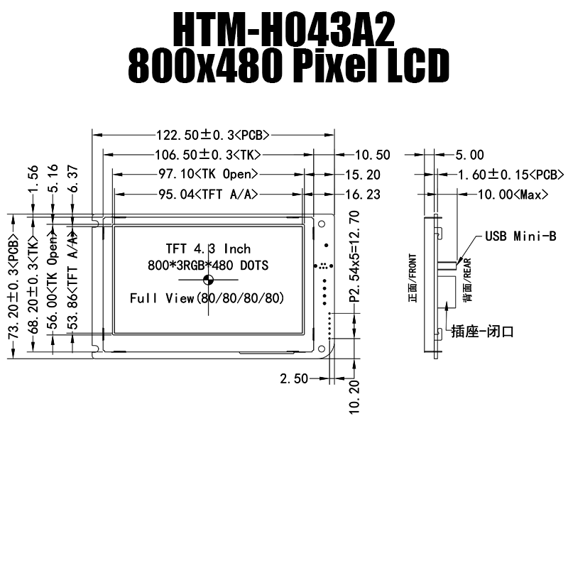4.3英寸對角線彩色TFT屏,標配無觸摸/電阻觸摸/電容觸摸