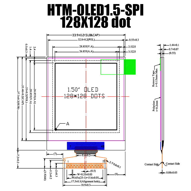 該顯示模塊的分辨率為 128x128 點,可提供令人難以置信的清晰度和細節(jié)。 A.A 區(qū)域尺寸為 26.855x26.855mm,提供充足的空間來展示您的內容。 其 33.9x37.3mm 的緊湊尺寸使其非常適合空間受限的應用。