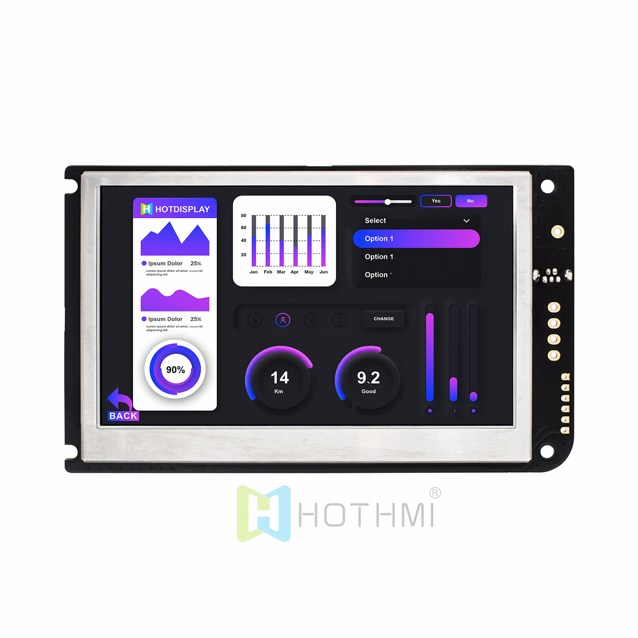 4.3英寸彩色電容觸摸TFT顯示模組/4.3英寸UART智能串口屏/800x480分辨率/IPS全視角TFT帶板模組 HTM-H043A10-A5-UART是一款4.3寸彩色串口顯示屏。它是一款I(lǐng)PS全視角的顯示屏,不管您從哪個方向觀看,都會呈現(xiàn)出良好的效果。標(biāo)準(zhǔn)亮度 LED 背光為 500 尼特,亮度適中。這個型號是不帶觸摸的版本,我們還可以為您定制帶有觸摸功能的。這款透射式 LCD 需要 5V 電壓電源,UART接口,HOTDISPLAY UART 顯示由兩部分組成:串口屏硬件和附帶的串口屏軟件: